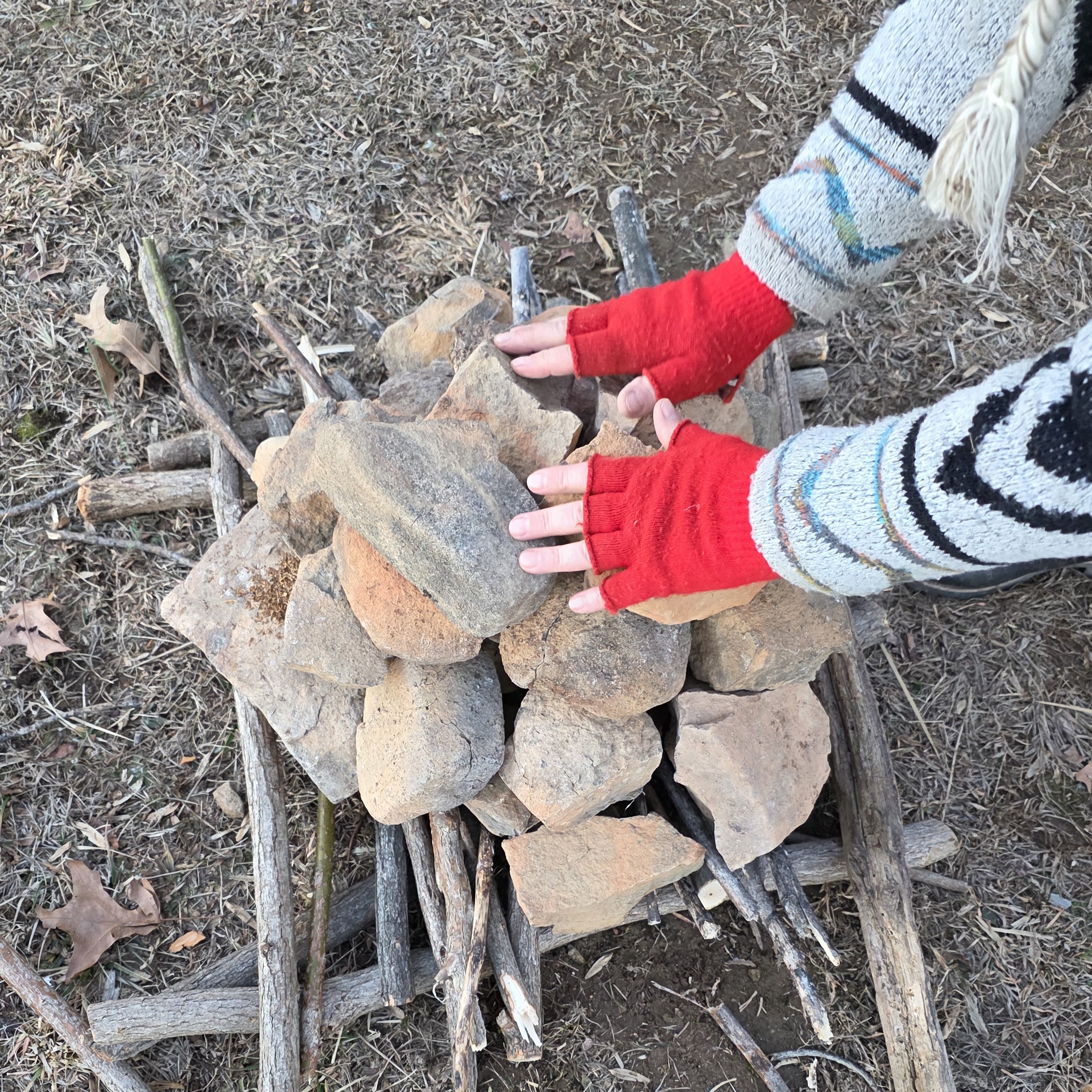 Above: The Grandfather stones resting where the sacred fire will be built atop them. They will be tended for nearly two hours until they reach a glowing red heat, ready for the ceremony.